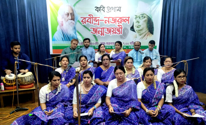 এরপর আবৃত্তিশিল্পী মুজাহিদুল ইসলামের সঞ্চালনায় অনুষ্ঠানে একে একে রবীন্দ্রনাথ ও নজরুলের গান পরিবেশন করেন শিল্পী শুভাগত চৌধুরী, রুপা দত্ত, সুমিত্রা বিশ্বাস, সীমা পাল, অর্পিতা দাশ, প্রিয়াংকা দাশ, সঞ্জিতা ভট্টাচার্য, মশিউল আনোয়ার খান, শিউলী নাথ, রুম্পি চৌধুরী, পলি চৌধুরী, চম্পা বিশ্বাস, আলপনা বড়ুয়া, দীপাশ্রী দে, পৃথ্বীশ ভট্টাচার্য, প্রান্তি চৌধুরী, অনির্বাণ নাথ এবং অরুন্ধুতী চৌধুরী।