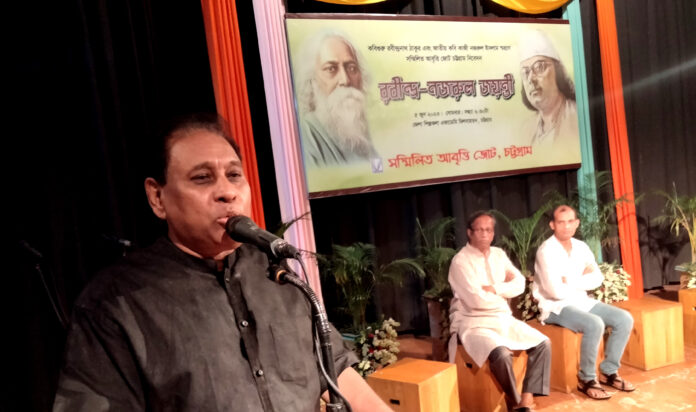 শিল্পকলা মঞ্চে একক, দ্বৈত ও সমবেত কন্ঠে কবিতার উচ্চারণে অনুষ্ঠিত হলো রবীন্দ্র-নজরুল জয়ন্তী। গতকাল ৫ জুন সোমবার নগরীর জেলা শিল্পকলা একাডেমি মিলনায়তনে দেশের ২২টি প্রতিনিধিত্বশীল আবৃত্তি সংগঠনের যৌথ মোর্চা সম্মিলিত আবৃত্তি জোট চট্টগ্রাম এর আয়োজনে কবিগুরু রবীন্দ্রনাথ ঠাকুর এবং জাতীয় কবি কাজী নজরুল ইসলামের জন্মজয়ন্তী উপলক্ষে এ ‘রবীন্দ্র-নজরুল জয়ন্তী’ অনুষ্ঠিত হয়।