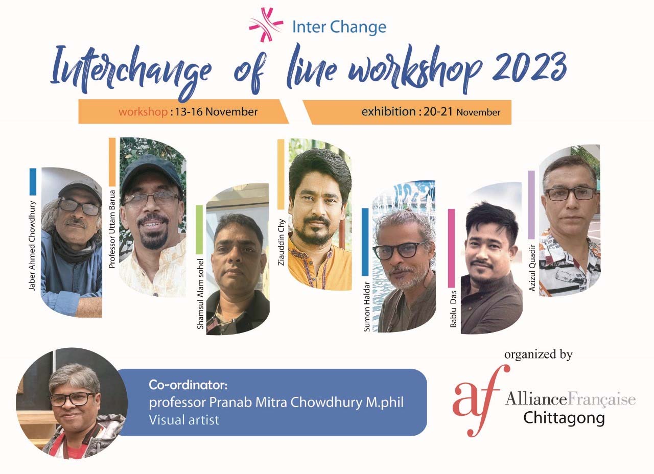 চট্টগ্রাম আলিয়ঁস ফ্রেঁসজ এর উদ্যোগে চারদিন ব্যাপী “ইন্টারচেইন্জ অব লাইন” শীর্ষক এক কর্মশালা ১৩ নভেম্বর থেকে আলিয়ঁস ফ্রসেজ মিলনায়তনে শুরু হয়েছে। এ উপলক্ষে বিকাল ৪টায় উক্ত কর্মশালা উদ্বোধন করেন আলিয়ঁস ফ্রেঁসজ চট্টগ্রামের পরিচালক মি. বু্রনো ল্যাকরেম্পে উক্ত কর্মশালা উদ্বোধন করেন। এ সময় আলিয়ঁস ফ্রেঁসজ চট্টগ্রামের উপ-পরিচালক ড. গুরুপদ চক্রবর্তী, কর্মশালার কো-অর্ডিনেটর চট্টগ্রাম বিশ্ববিদ্যালয়ের চারুকলা ইনস্টিটিউটের প্রফেসর প্রণব মিত্র চৌধুরী, কর্মশালায় অংশগ্রহনকারী শিল্পীরা হলেন চট্টগ্রাম বিশ্ববিদ্যালয়ের চারুকলা ইনস্টিটিউটের প্রফেসর উত্তম বডুয়া,