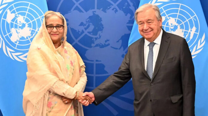 শেখ হাসিনাকে লেখা চিঠিতে জাতিসংঘ মহাসচিব অ্যান্তোনিও গুতেরেস বলেন, ‘গণপ্রজাতন্ত্রী বাংলাদেশের প্রধানমন্ত্রী হিসেবে পুনরায় নির্বাচিত হওয়ার জন্য আমি আপনাকে অভিনন্দন জানাই।’