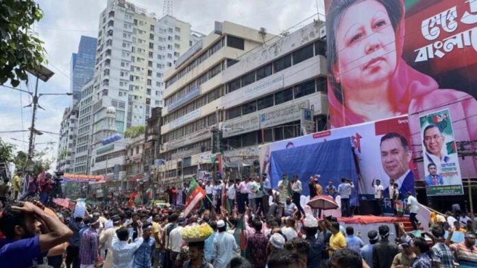 এদিকে সমাবেশ মঞ্চের মাইক থেকে বলা হচ্ছে, আজ আমরা মুক্ত। বিজয় অর্জন করেছি। এখন অনেক সুযোগ সন্ধানী দলে ভিড়তে চাইবে। নিজেদের মধ্যে বিশৃঙ্খলা সৃষ্টি করতে চাইবে। এটা হতে দেওয়া যাবে না। মঞ্চ থেকে নেতাকর্মীদের বিচারপতির বাসভবন, পল্টন থানাসহ গুরুত্বপূর্ণ স্থাপনা পাহারা দিতে নির্দেশ দেওয়া হচ্ছে।